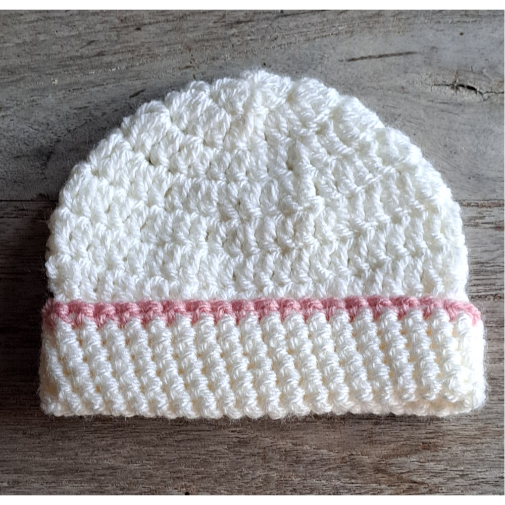 Baby Beanie / Mutsje, wit met roze rand