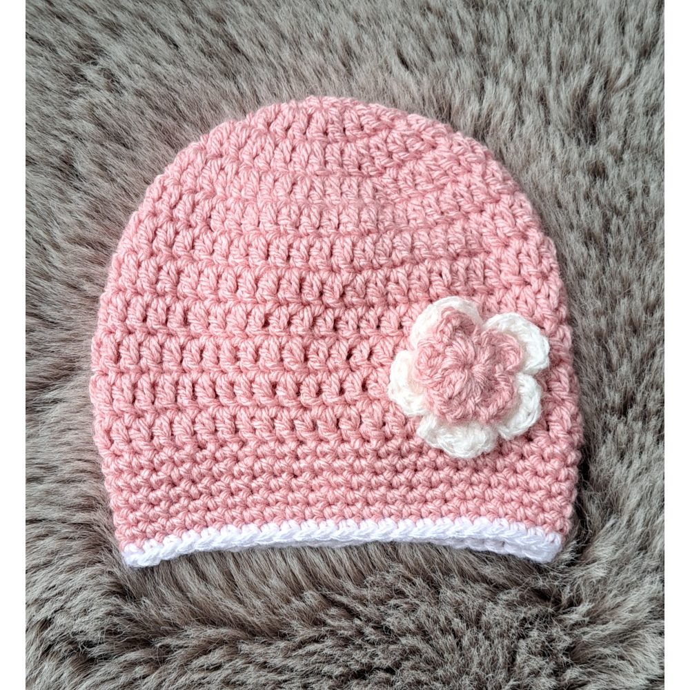 Baby Beanie / Mutsje , oudroze + witte rand met bloem