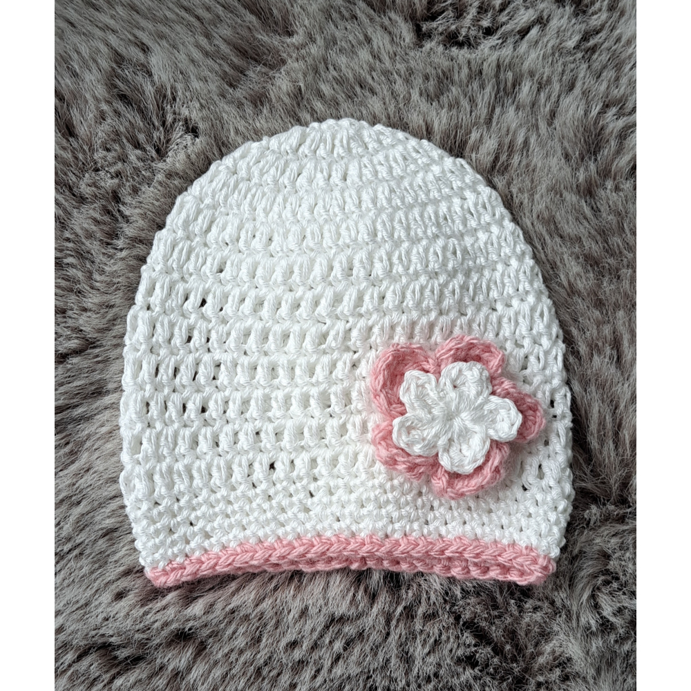 Baby Beanie / Mutsje, wit + oudroze met bloem