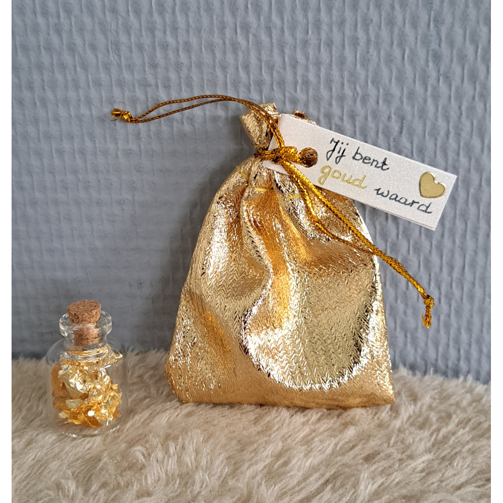 Dat kan door middel van dit klein, maar waardevol gouden tasje 'Jij bent goud waard' , met daarin een glazen flesje gevuld met bladgoud