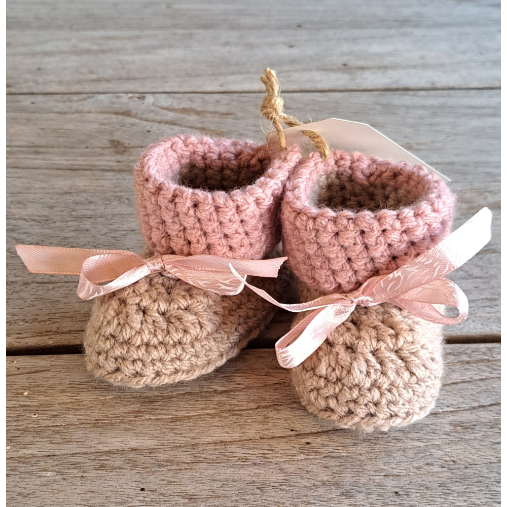 Baby Booties / Slofjes, linnen + oudroze met strikjes