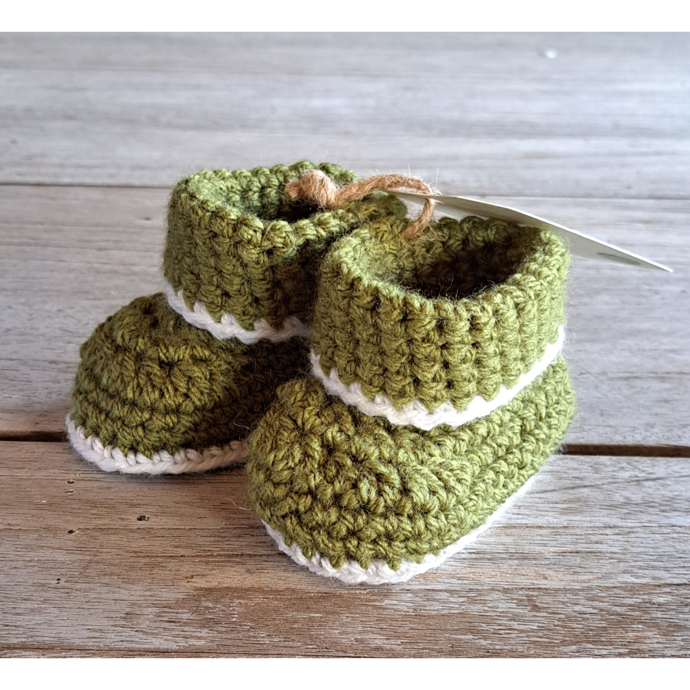 Baby Booties / Slofjes, groen + witte rand
