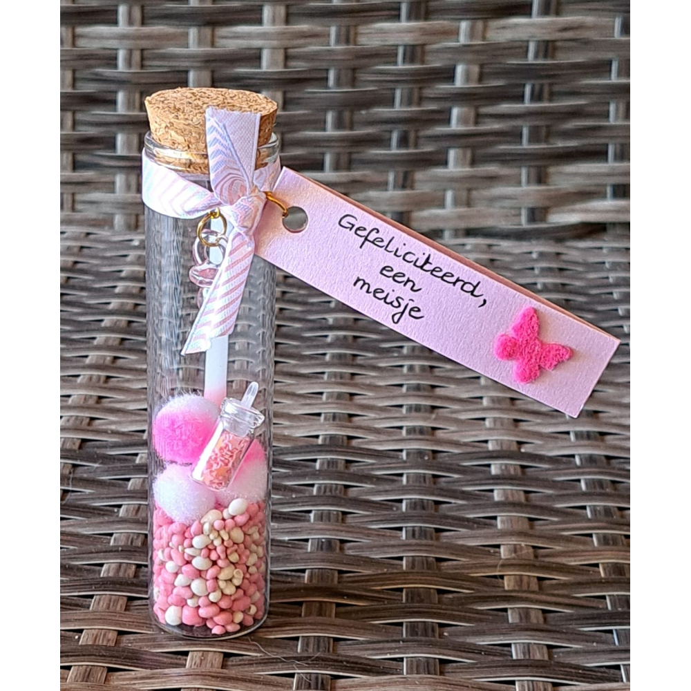 Het Geboorteflesje groot - Gefeliciteerd, een meisje is een prachtig kraamcadeau om de komst van een meisje feestelijk te vieren. Dit grote flesje is met zorg samengesteld en biedt een mooie symbolische touch om deze bijzondere gebeurtenis te markeren. Met zijn stijlvolle afwerking is het een prachtig aandenken dat kersverse ouders nog lang zullen koesteren.