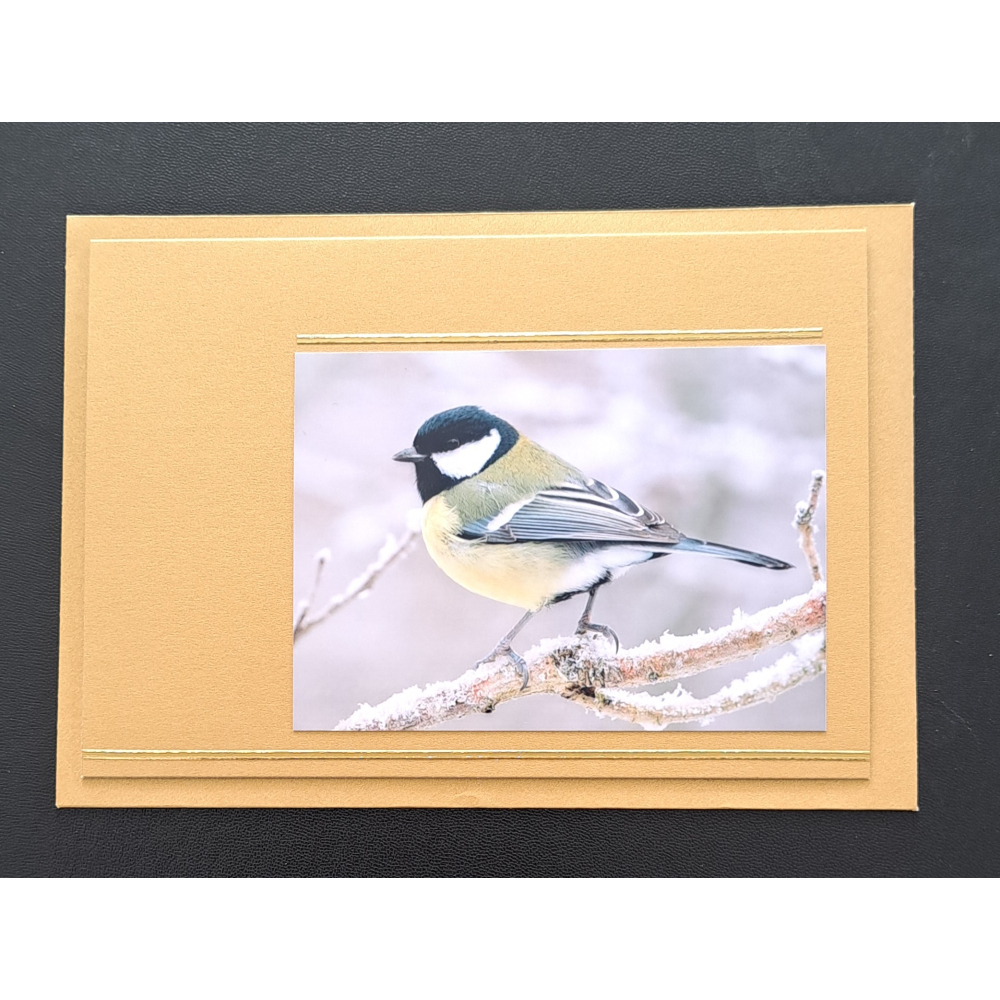 Natuur ansichtkaart - Koolmees op tak / winter - goud