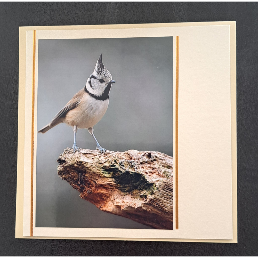 Natuur ansichtkaart - Kuifmees op stronk - vierkant ivoor