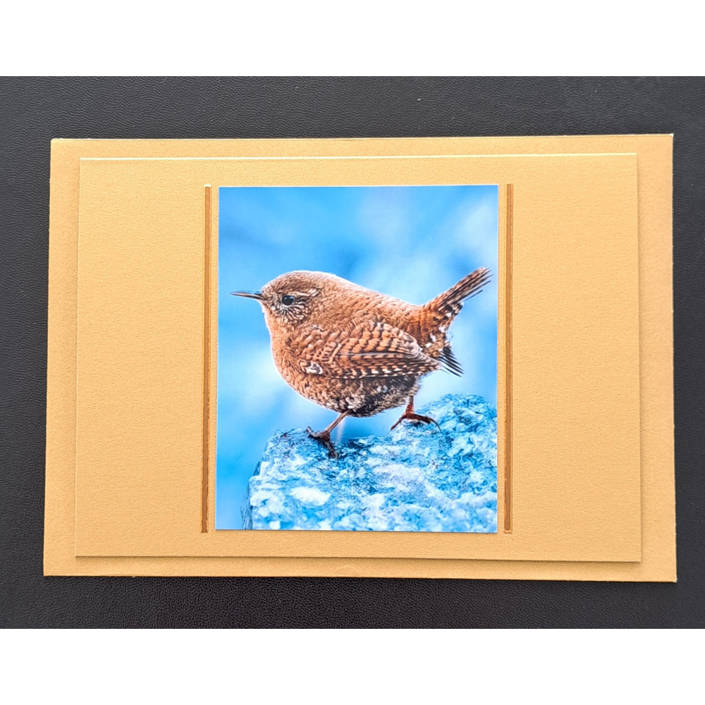 Natuur ansichtkaart - Winterkoninkje op steen - goud