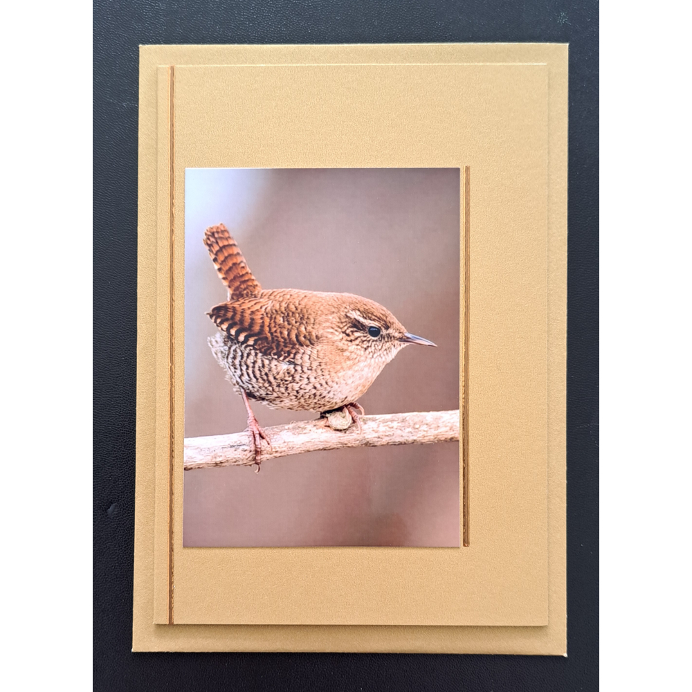 Natuur ansichtkaart - Winterkoninkje op tak - goud