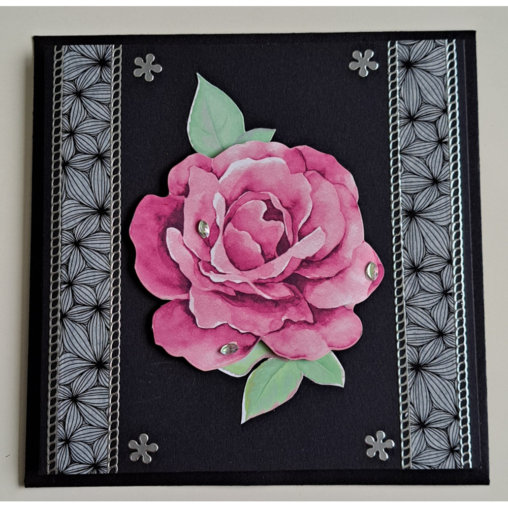 Rouw wenskaart, zwart met roze roos + wit inlegvel + envelop