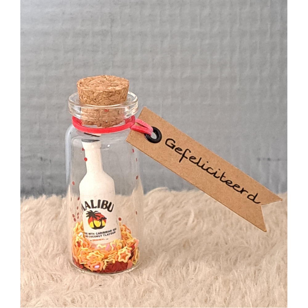 Miniatuur flesje 'Malibu' / gekleurde glitters / label Gefeliciteerd