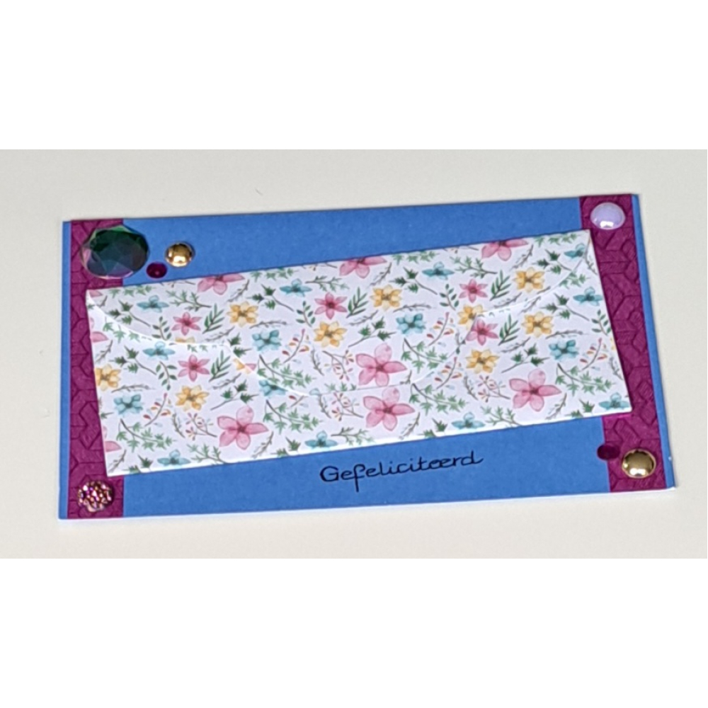 Wenskaart gefeliciteerd blauw + cadeau envelopje, bloemen