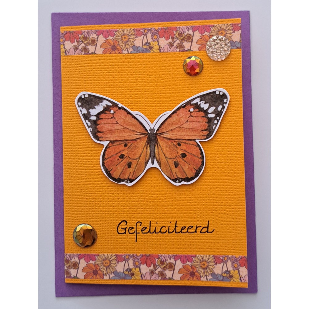Wenskaartje klein gefeliciteerd ,oranje + envelopje / vlinder